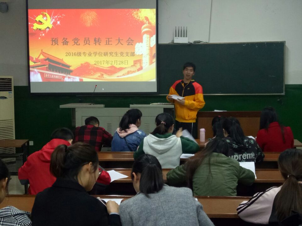 (通讯员 李芳芳 傅小利)2月28日晚,yl23455永利官网2016级研究生党支部在教学楼顺利召开了预备党员转正会议。会议主要讨论科学学位党支部霍添、李芳芳、刘涵和专业学位党支部曹铭四名预备党员的转正事宜。专业学位党支部书记吴婷、科学学位党支部书记罗佳分别主持了会议,我司2016级研究生全体正式党员、预备党员和部分入党积极分子参加了本次会议。