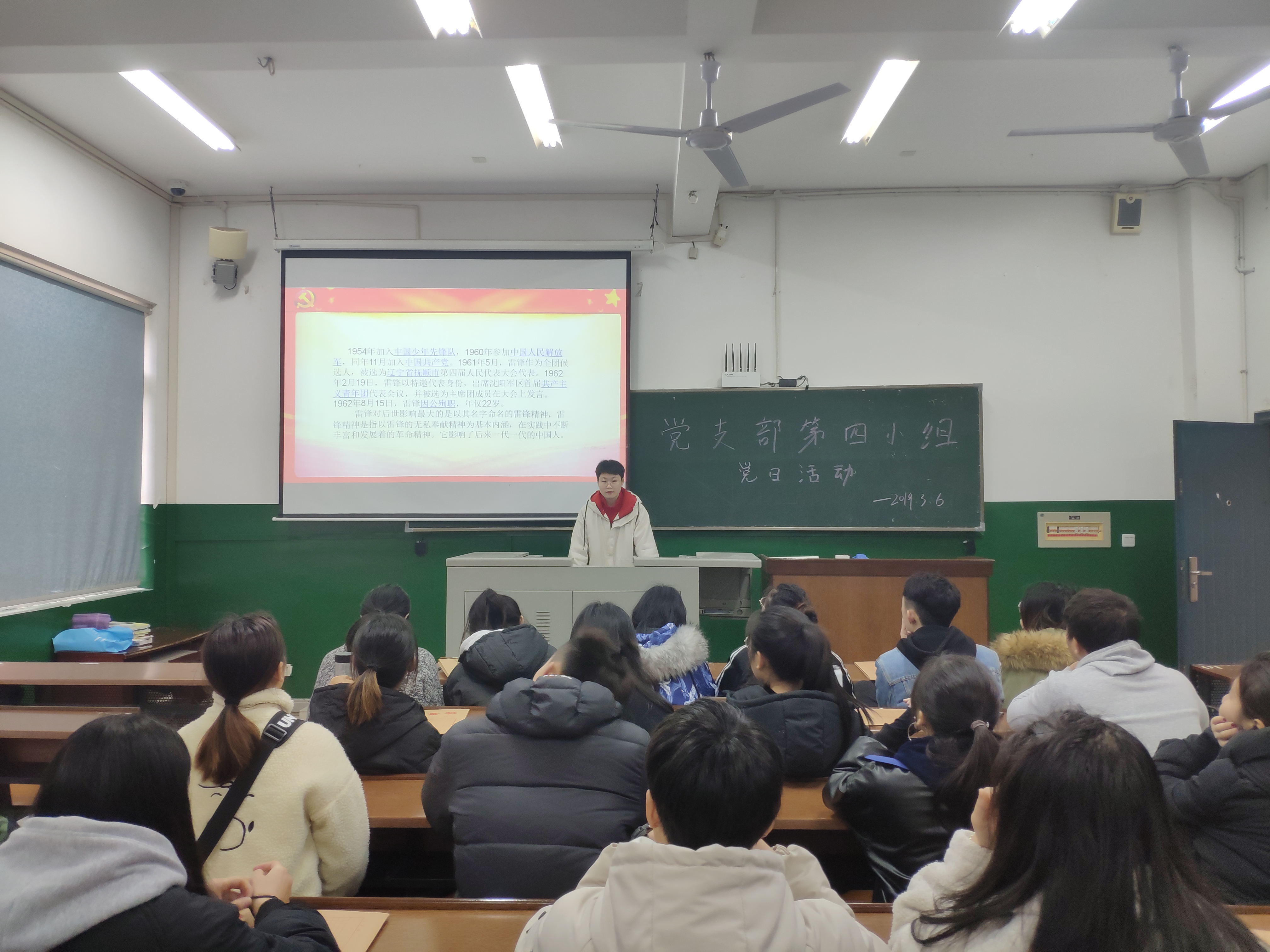 随后,成员戴文婧同学对PPT进行了讲解并组织大家观看视频,带领同学们学习了雷锋精神。学习雷锋精神有利于养成爱憎分明的立场,学习言行一致的革命精神,发扬公而忘私的共产主义风格。紧接着,第四小组全体成员齐唱《学习雷锋好榜样》。