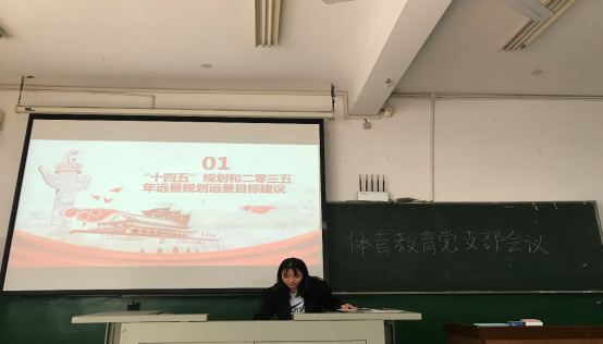 本次会议由本科生体教党支部小组长易雯婷主持,会议主题为:十四五“规划和二零三五年远景规划远景目标建议。