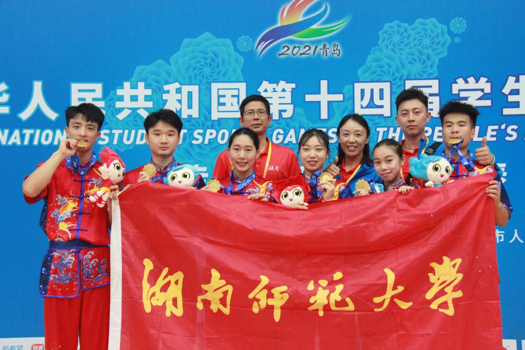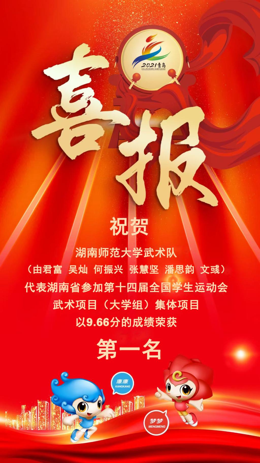 我司武术队在校领导和院领导的大力支持下,由yl23455永利官网党委副书记李波担任领队,雷军蓉、杨健男两位老师担任教练,带领6名队员征战学运会赛场,同时也代表湖南省大学组参赛。战鼓擂响,旗帜飘扬,运动健儿们始终坚持着“厚载博学、行健自强”的体院精神,奋力拼搏,经过三天的激烈角逐,不畏强手,奋勇争先,取得了1金1银3铜等荣誉,不仅表现了高超的竞技水平和湖南大学生精神风貌,更展现出湖师大学子的夺人风采,续写了武术与民族传统体育新的篇章!在此由衷的感谢领导的大力支持,佳绩的背后离不开领导和老师的关怀与帮助。以梦为马,不负韶华,民传学子将继续秉持师大精神砥砺前行,争取再创辉煌。