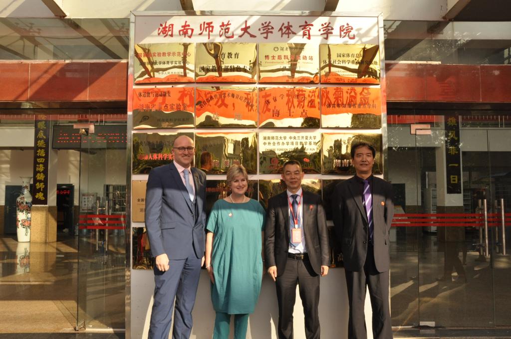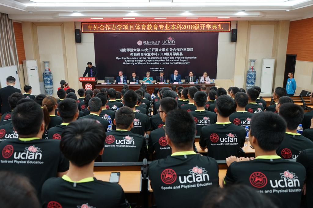 (通讯员 余友)10月27日下午三点,中外合作办学体育教育专业2018级新生开学典礼在我司教学楼一楼阶梯教室举行。中央兰开夏大学高级副校长丽兹•布罗姆利女士、国际战略与合作副校长提姆•斯蒂尔先生、外事处合作项目主任保罗•罗伊先生、体育与健康学院院长艾德里安•伊贝森先生、健康与福祉学部国际负责人 杰基·戴-加纳女士、中国区主任葛继飞、高级国际专员文小榕,我司副校长蒋新苗、国际交流合作处处长陈云江,我司院长汤长发、副院长刘花云、郑澜、郭献中、黄文斌出席。汤长发主持开学典礼。