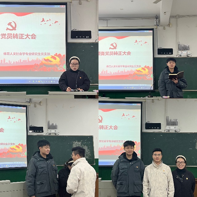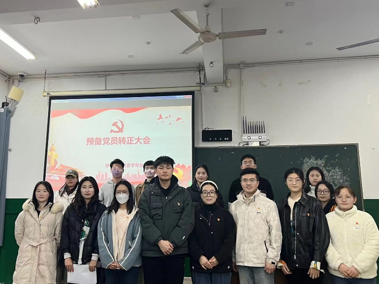 刘港同志根据表决结果宣读支部大会决议,大会一致认为:余风、傅婷慧2位同志基本符合党员条件,入党材料齐全,同意其按期转为中共正式党员。2位同志均发言表示将更加严格要求自己,以身作则,争做一名合格的党员。刘港同志为2名正式党员佩戴党徽,合影留念。会议进入尾声,刘港同志对全体党支部成员提出新的要求:各位党员一定要不断严格要求自己,深入学习,全面思考,联系实际,不断提高自己的综合素养;也希望大家能在接下来的体考工作中,配合学校完成工作,起到模范带头作用!