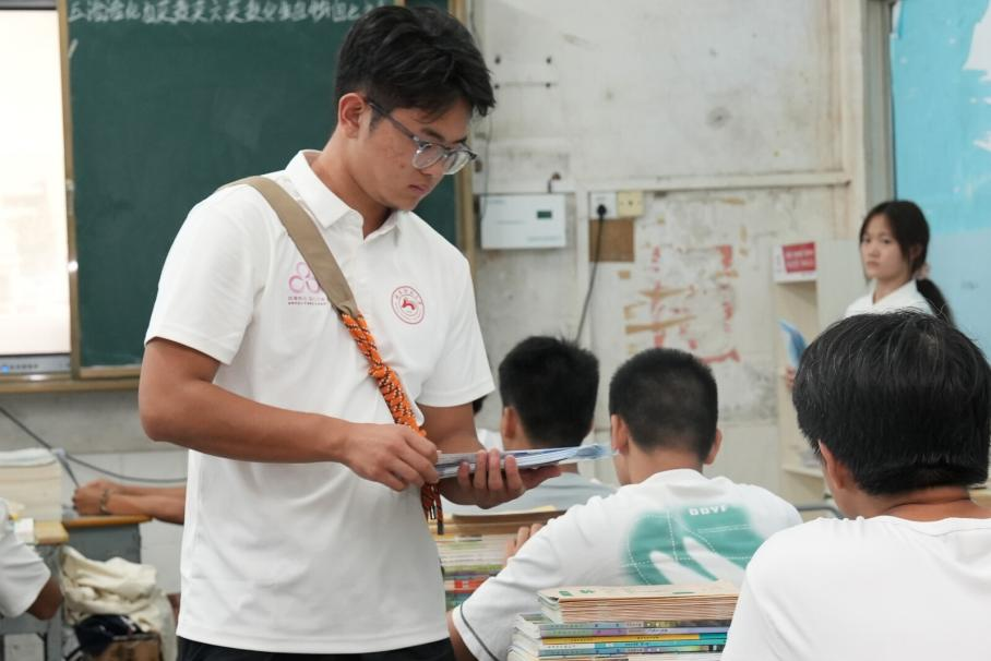 图为实践团成员魏俊宇在分发宣传手册 杨蔚洲供图